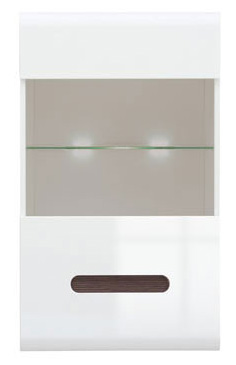 • 1 распашная дверь со стеклянной вставкой (стекло – закаленное, бронзовое), за которой расположены 2 полки из ДСП ламинированной и стеклянная полка (стекло прозрачное);