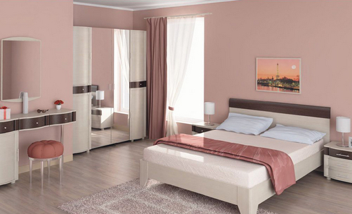 В спальный гарнитур Дольче-Нотте №1 входит самый необходимый комплект: большая кровать КР-110, две прикроватные тумбы с тремя ящиками ТБ-108, туалетный столик с зеркалом СТ-106 и большой шкаф из двух ШК-141 и ШК-111. Выполнена мебель в комбинированном цвете - дуб беленый с дубом венге. В таком исполнении даже тяжелый шкаф выглядит нежным и изящным, не говоря уже о кровати. Темный дуб помогает выставить на первый план светлый тон и форму мебели, сам же остается в тени, не отвлекая внимание на себя. Правда чудесную банкетку, которую вы видите на картинке, купить нельзя.