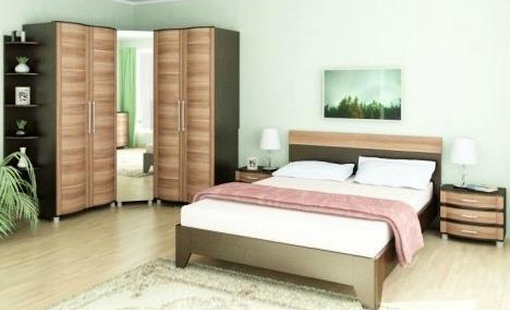 Спальня Дольче-Нотте имеет много вариаций цвета и комплектации, данная композиция выполнена в оттенке дуб венге/слива валлис. В таком исполнении даже тяжелый угловой шкаф ШК-113 и два ШК-108 выглядят нежными и изящными, не говоря уже о кровати КР-110, которую дополняют две большие прикроватные тумбы. Темный дуб помогает выставить на первый план натуральный, теплый тон дерева и форму мебели, сам же остается в тени, не отвлекая внимание на себя.