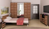 Дольче-Нотте №13 в цвете дуб венге/слива валлис имеет полную комплектацию. В ней есть большой шкаф-купе и необычный комод ТБ-106, который может служить и тумбой для TV аппаратуры. Кроме выдвижных ящиков, в нем есть секции с глухими дверями и ниша для видео техники. Прикроватные тумбы ТБ-107 и кровать КР-102 - небольшие, но удобные. Компактные размеры позволят разместить все элементы в маленькой комнате.