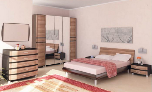 Спальня Дольче Нотте-15 собрана из традиционных позиций, а именно: кровать КР-102, самый главный элемент для спальни, затем прикроватные тумбы ТБ-107 (они широкие, с двумя шкафами), комод для белья КМ-102 с зеркалом ЗР-101 и наконец, шкаф, который составили из нескольких сегментов. Два шкафа с зеркальными дверями ШК-111 и ШК-112 образовали центральную часть из трех створок, а два ШК-141 с глухими дверями приставлены по краям композиции.