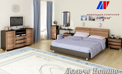 Очень органичная Дольче-Нотте №16 выполнена в цвете дуб венге-слива валлис. Особенно стоит выделить туалетный столик СТ-104, его нетрадиционная форма создала ступенчатый эффект мини полки и совершенно разрушили стереотипное представление о будуаре. Большой комод ТБ-106 частично компенсирует отсутствие шкафа в данной композиции и выполняет несколько ролей в данной спальне. Он сможет стать полноценной тумбой для телевизора или комодом для белья, а может быть и тем и другим одновременно. Спинка у кровати КР-104 причудливо изогнута, и выполнена в контрастном цвете, что делает ее еще более заметной.