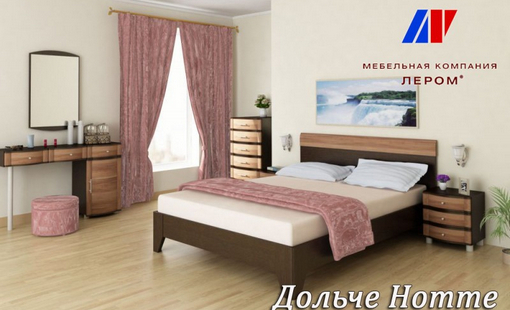 Уникальная и очень органичная Дольче-Нотте №18 выполнена в цвете дуб венге-слива валлис. Особенно стоит выделить туалетный столик СТ-106, его нетрадиционная форма создала эффект мини полки и совершенно разрушили стереотипное представление о будуаре. Высокий комод КМ-103 частично компенсирует отсутствие шкафа в данной композиции. Спинка у кровати КР-110 совершенно прямая, и выполнена в контрастном цвете, а ножки у кровати широкие и устойчивые, что делает ее еще более заметной.