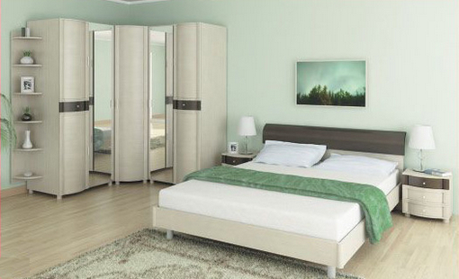 Спальня Дольче-Нотте имеет много вариаций цвета и комплектации, данная композиция выполнена в оттенке дуб беленый комбинированный с дубом венге. В таком исполнении даже тяжелый угловой шкаф ШК-110, два ШК-112 и две секции ШК-141 выглядит нежным и изящным, не говоря уже о кровати КР-106. Темный дуб помогает выставить на первый план светлый тон и форму мебели, сам же остается в тени, не отвлекая внимание на себя.