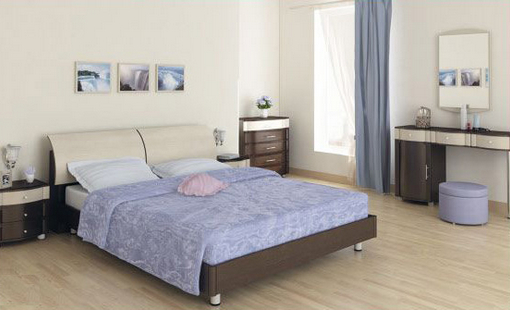 Уникальная и очень органичная Дольче-Нотте №5 выполнена в цвете дуб венге комбинированный. Особенно стоит выделить туалетный столик СТ-106, его нетрадиционная форма создала эффект мини полки и совершенно разрушили стереотипное представление о будуаре. Широкий комод КМ-102 частично компенсирует отсутствие шкафа в данной композиции. Спинка у кровати КР-104 причудливо изогнута, и выполнена в контрастном цвете, что делает ее еще более заметной.