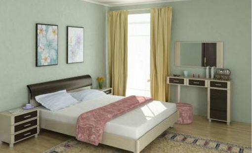 В спальный гарнитур Камелия-1 входит самый необходимый комплект: большая кровать КР-106, две прикроватные тумбы с тремя ящиками ТБ-708 и туалетный столик СТ-706 с зеркалом ЗР-701. Выполнена мебель в комбинированном цвете - дуб беленый с дубом венге. Шкафа в данной композиции нет, но ассиметричный столик с выдвижными шкафами СТ-706 делает спальню вполне законченной. Такая комплектация подойдет небольшим спальням или апартаментам с гардеробной комнатой.