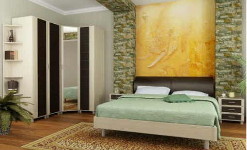 Камелия-5 предназначена для больших комнат. Кровать КР-104 со спальным местом 1600х2000, широкие и вместительные прикроватные тумбы ТБ-708, занимают центральное место. Угловой шкаф представляет собой мини гардеробную комнату с приставными полками, а состоит он всего из трех элементов и полки ПЛ-101: ШК-708, угловой ШК-713 и пенал ШК-709. Цвет дуб беленый комбинированный и фасад, напоминающий жалюзи, стилизует спальню под этно или средиземноморский шик. В любом случае она смотрится очень колоритно и свежо.