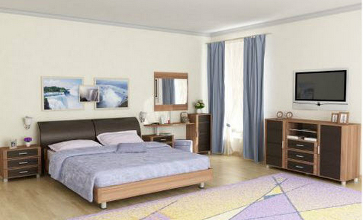 Данная композиция предназначена для небольшой комнаты, шкафа в ней нет, но есть большой комод-тумба ТБ-706, который можно использовать не только как комод для белья, но и как тумбу для телевизора и другой видеотехники. Спальня без шкафа всегда рассматривается как будуар, для такого применения есть главное ее составляющее: кровать КР-104, прикроватные тумбы ТБ-708 и туалетный столик СТ-704 с зеркалом ЗР-702.