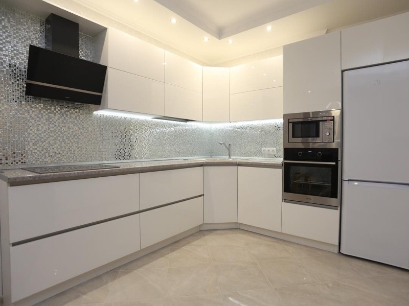 Цвет корпуса, фасада, столешницы, стекла, ручки могут быть практически любыми, цена при этом не поменяется. Кухня может быть оснащена доводчиками (Blum, Boyard).