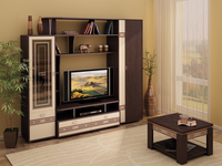 Универсальный плательно-бельевой шкаф (со штангой для одежды или полками – на выбор), большие выдвижные ящики, вместительная ниша под телевизор, открытые полки делают «Симфонию 6.10» необходимым элементом гостиной.