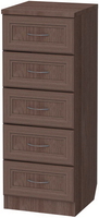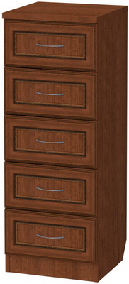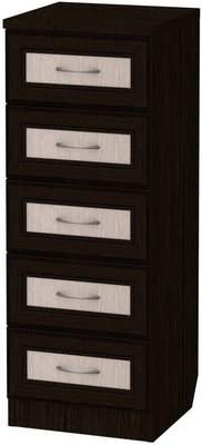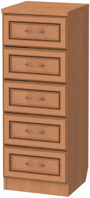 Комод оснащен пятью ящичками, которые оборудованы выдвижными механизмами. Они комплектуются удобными металлическими ручками и простым декоративным украшением в виде строгой четырехугольной каемки. Данный декоративный элемент отлично подчеркивает незамысловатый, но привлекательный дизайн представленной вам модели мебели. Благодаря притягательной простоте комода он отлично вписывается в любой мебельный ансамбль, прекрасно дополняя стилистику остальных предметов мебели.